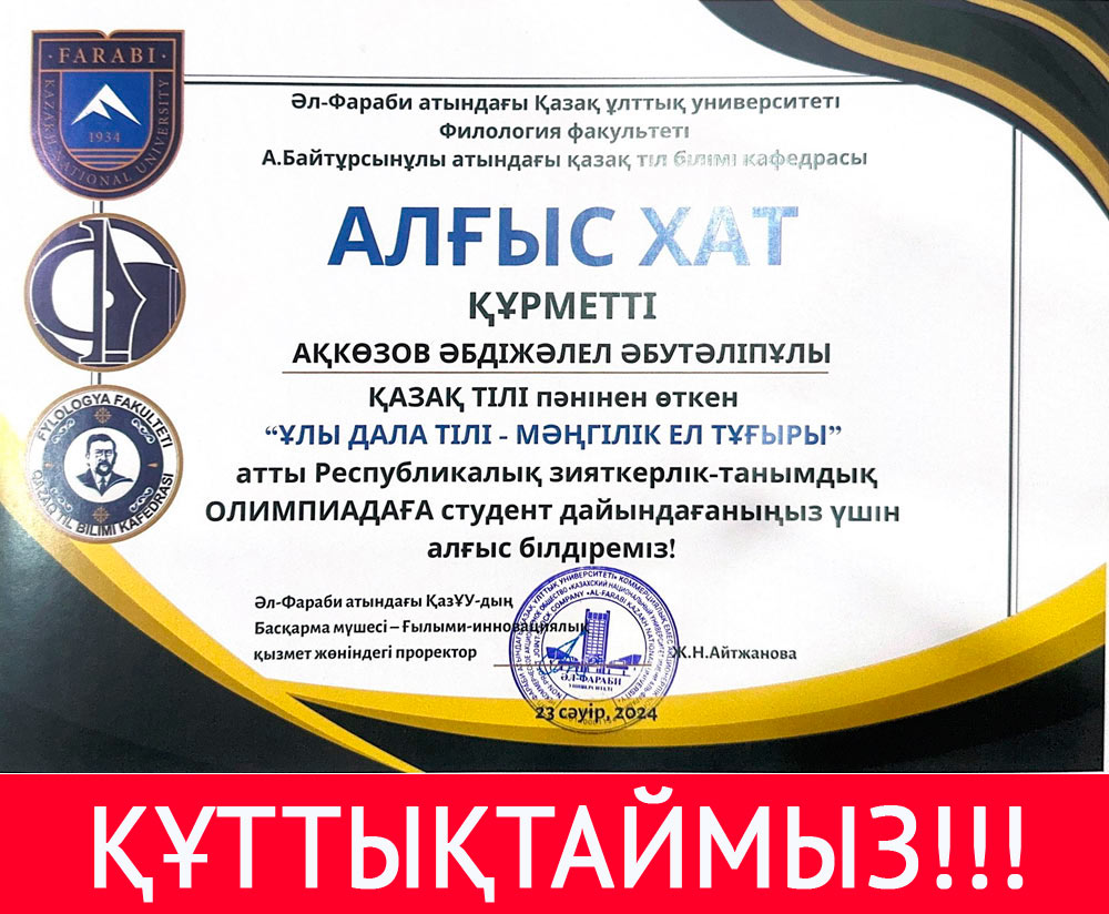 On April 23, 2024, under the organization of the Al-Farabi Kazakh National University, the Republican Intellectual and Cognitive Olympiad in the subject of the Kazakh language “The language of the great steppe is the basis of the eternal country” was held.