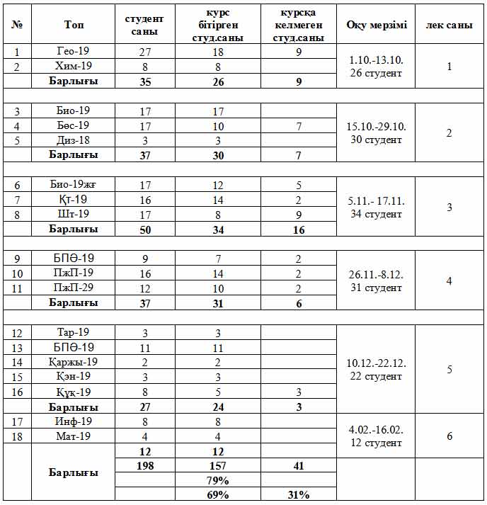 Курсты тыңдаушылар контингенті 198 студент болуына байланысты сабақтарды алты лекке бөліп оқыту жоспарланды, ал 157 студент осы курсы толық бітірді (төменгі кестеде көрсетілген).