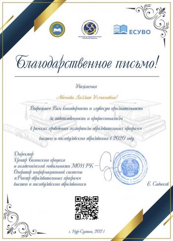 The Center for Bologna Process and Academic Mobility of the Ministry of Education and Science of the Republic of Kazakhstan as a Expert has sent a letter of thanks for the responsibility and professionalism in the examination of higher and postgraduate education programs to Abenova Lazzat Usmanovna, Acting Associate Professor of the Department of Kazakh Language and Literature, Candidate of Philological Sciences, Scientific Secretary of the Syrdarya University.