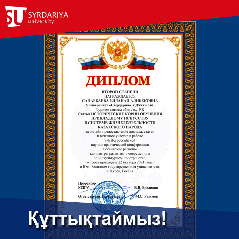 The second degree diploma is awarded to Uldanai Alibekovna Saparbayeva for active participation in the 7th All-Russian Scientific and Practical Conference "Russian Regions as Development Centers in the Modern Sociocultural Space", which took place on October 22, 2021, at the South-Western State University, Kursk , Russia. The article "Historical roots of teaching applied arts in the system of life of the Kazakh people".