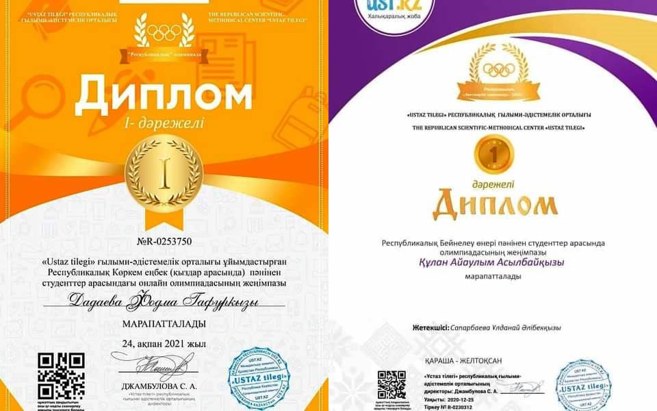 Dadaeva Fodma Abdygafurovna, 2nd year student and Kulan Ayaulym Asylbaevna, 3rd year student of educational program 5В010700 - "Fine Arts and Drawing" were awarded 1st degree diplomas in the Republican subject of interdisciplinary art (among girls) and students of fine arts, organized by the Methodological Center.