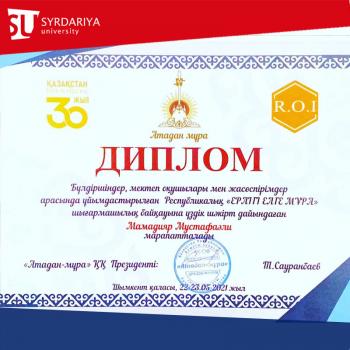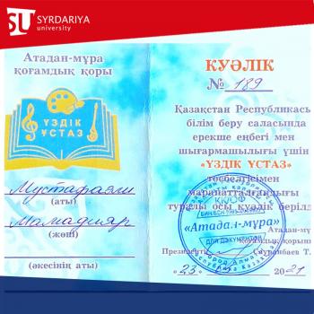 Mamadiyar Mustafali, 3rd year student of the educational program 5B010600 - "Music Education", Department of "Art", Faculty of Design and Art, Sirdariya University He was awarded the badge "Best Teacher" and a diploma of gratitude of the public fund "Atadan-Mura".