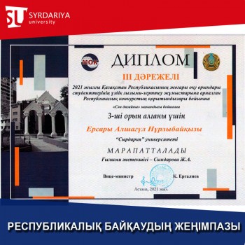 According to the results of the Republican competition for the best research work of students of higher educational institutions of the Republic of Kazakhstan in 2021, Yersaly Alshagul Nurlybaykyzy was awarded a diploma of the III degree for the 3rd place in the educational program "Design of clothes".