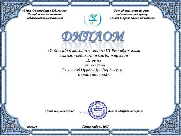 The teacher of the department "Software" Tastekov Nurbek Kaldarbekovich congratulated the 3rd place in the 3rd Republican scientific and pedagogical competition "The Best Lesson Plan" organized by the Republican Scientific and Pedagogical Center "Bilyim-Obrazovanie-Education".