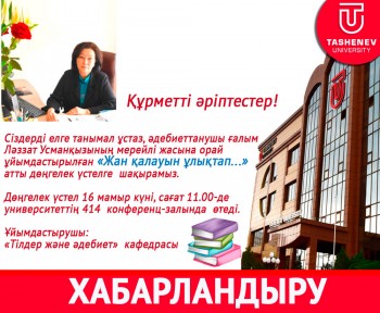 Сіздерді елге танымал ұстаз, әдебиеттанушы ғалым Ләззат Усманқызының мерейлі жасына орай ұйымдастырылған «Жан қалауын ұлықтап...» атты дөңгелек үстелге шақырамыз.