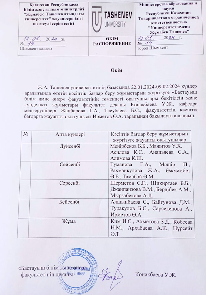 22.01.2024-09.02.2024 күндер аралығында Ж.А. Тәшенев университетінің базасында ұлттық бірыңғай тестілеу өтетінін хабарлаймыз. Осы күндері «Бастауыш білім жіне өнер» факультетінің оқытушылары бекітілген график бойынша кәсіптік бағдар жұмыстарын жүргізетін болады. Кәсіптік бағдар беру жұмысы жас ұрпақтың саналы түрде болашақ мамандығын қателеспей таңдауға мүмкіндік жасайды.