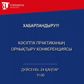 «Сырдария» университетінде 24 қаңтар 2022 жылы сағ: 11:00. 4 курс студенттерімен кәсіптік практиканы ұйымдастыру және бағыт бағдар беру мақсатында орнықтыру конференциясы өтеді.