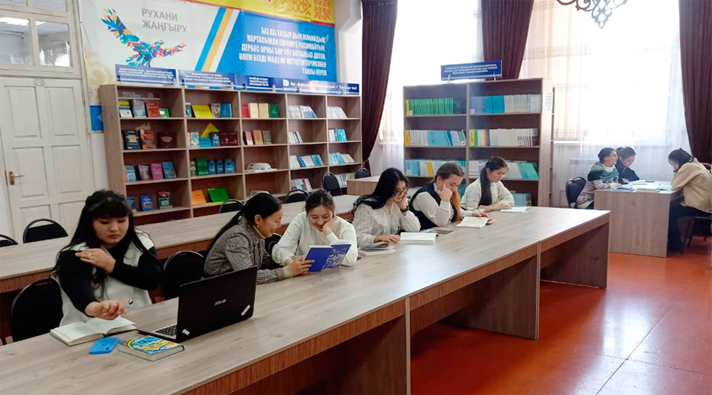 Оқу залы жұмысының маңызды принципі жылдамдық және дәлдік, мұнда оқытушылар мен студенттер кітап қорының барлық түрін пайдалануға мүмкіндігі бар. Оқу залының ашық қор негізіндегі көркемдігі мен жайлылығы шығармашылық жұмыспен айналысуға қолайлы жағдай туғызады. Сіздерге көптеген әлем тілдеріндегі оқу құралдары мен сөздіктерін, шет тіліндегі мерзімді басылымдарын (ағылшын, неміс, өзбек, түрік, француз), сыйға тартылған аса құнды шетелдік әдебиеттер топтамасын ұсына алады. Әмбебап және салалық энциклопедиялық қор пайдаланушылар тілегін толық қанағаттандырып, студенттердің ерекше ілтипатына бөленуде.