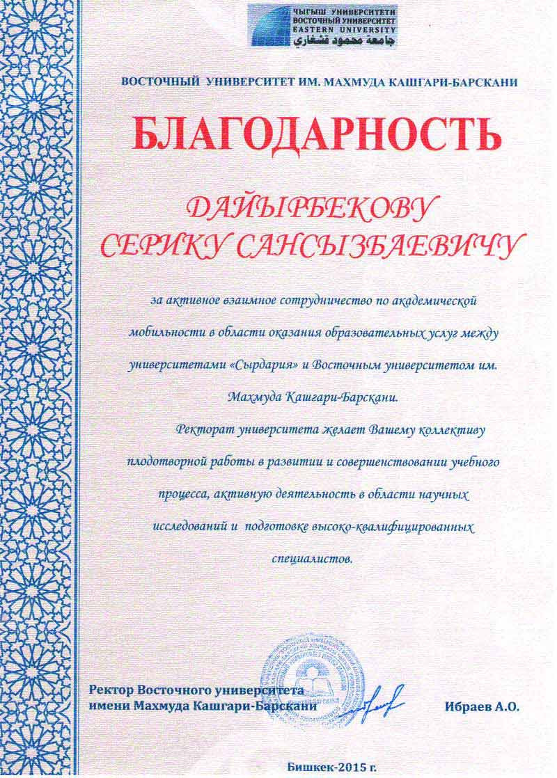 Махмуд Кашкаги-Барскани атындағы Шығыс университетінің ректоры, ректор А.О.Ибраев ұсынған «Сырдария» университетінің ректоры Серік Сансызбайұлы Дайырбековке «Сырдария» арасындағы білім беру қызметтерін ұсынуда академиялық ұтқырлық бойынша белсенді өзара әрекеттестігі үшін ризашылығын білдіреді. «университеттер мен Шығыс университеті. Махмуд Қашгари-Барскани.