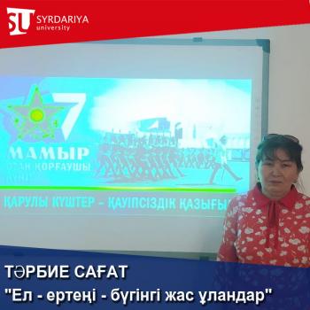 Бүгін "Сырдария университетінің "Заңтану және экономика" факультетінің "Құқық және экономика" кафедрасының оқытушысы ғ.м. Адамбекова М.Т. 1-курс студенттеірмен "7-мамыр - Отан қорғаушылар күні" мерекесіне орай "Ел - ертеңі - бүгінгі жас ұландар" тақырыбында тəрбие сағат өткізді!
