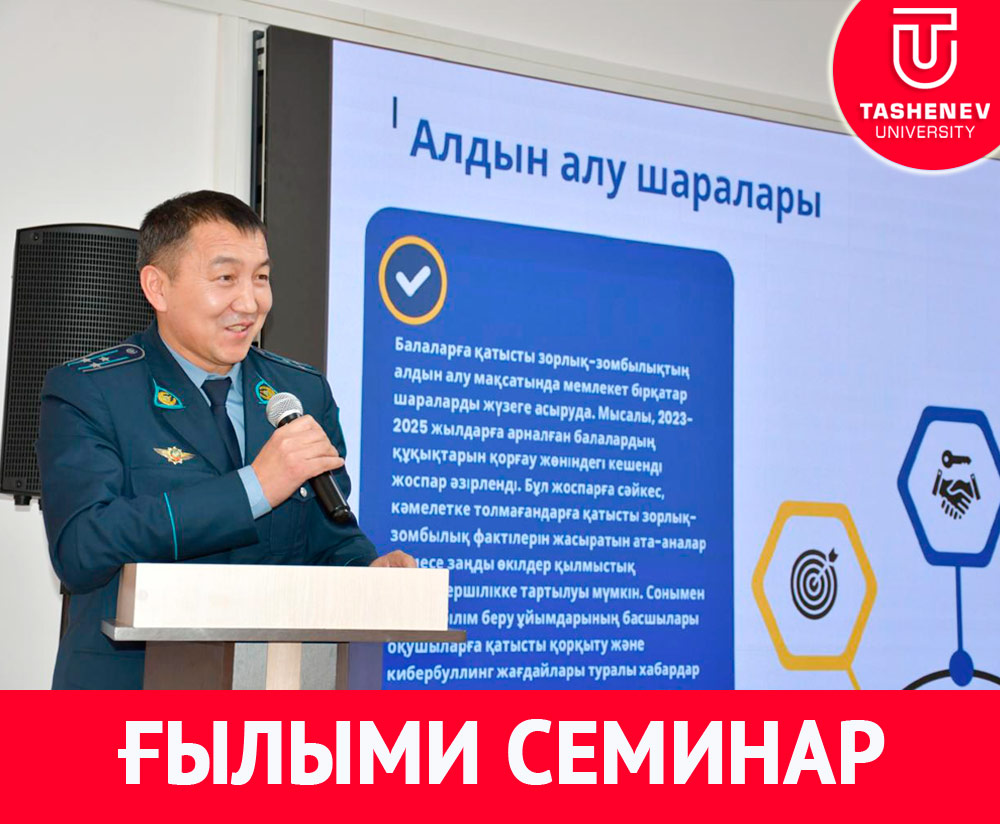 Әл-Фараби атындағы Қазақ ұлттық университеті мен Ташенов университеті арасындағы жасалған келісім шарттың негізінде құрылған «Балалардың зорлық-зомбылығын алдын алу» модульдік орталығының жұмысын жандандыру мақсатында 7 ақпан күні Ювеналды полиция, психолог мамандар, ғалымдардың қатысумен ғылыми семинар өткізілді. Ғылыми семинарда әл-Фараби атындағы Қазақ ұлттық университетінің профессоры з.ғ.д. Г.Атаханова, Б. Момышұлы атындағы ҚР ІІМ оқу орталығының цикл басшысы з.ғ.к. Т.Қаратаев, Ж.А. Ташенов университетінің «Құқық және бизнес» кафедрасының меңгерушісі Н.Р. Бижан аталған қылмыстың алдын мәселелері жөнінде баяндама жасады. Семинар қорытындысында аталған қылмыстылықтың алдын алу мақсатында заңнамаларына өзгерістер мен толықтырулар енгізу ұсынылды. Семинарға қатысушылар «Экономика және құқық» факультеті, «Құқық және бизнес» кафедрасының ұйымдастырған ғылыми семинарға жоғары баға берді