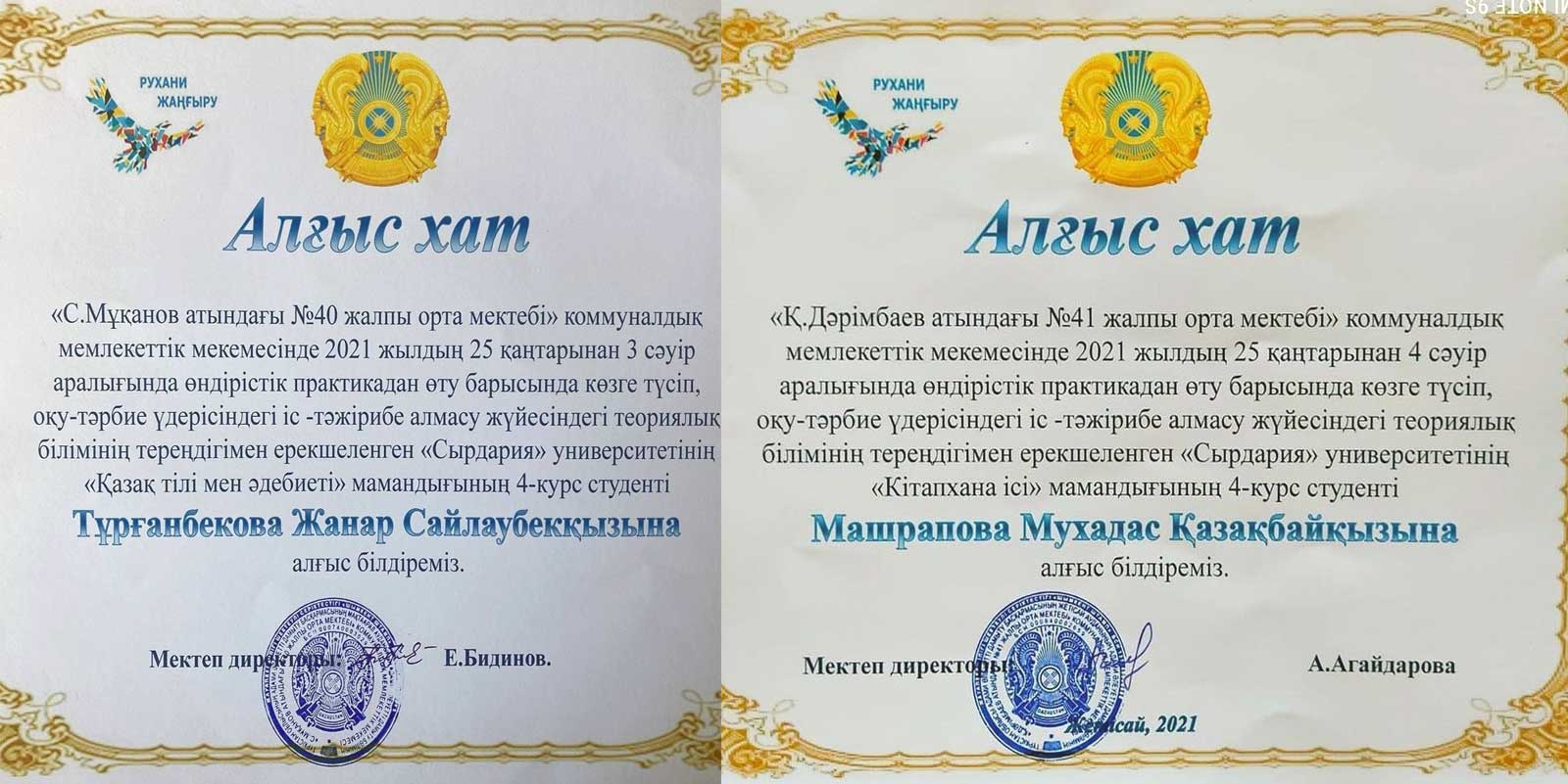 Әрине, шәкіртінің озық болғаны, білімділік, біліктілік дәрежесін көрсеткені ұстаздарының қажырлы еңбегінің жемісі деуімізге болады. Осы орайда, «Сырдария» университеті «Қазақ тілі мен әдебиеті», «Кітапхана ісі» білім беру бағдарламаларының 4-курс студенттері 2021 жылдың 25 қаңтар мен 4 сәуір күндері аралығында Жетісай, Шардара, Сарыағаш, Мақтаарал аудандарының мектептерінде 10 апталық кәсіби педагогикалық, өндірістік іс-тәжірибедан өтіп қайтты.