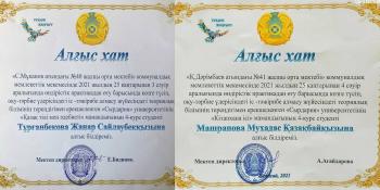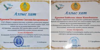 Студенттеріміздің білімділігіне, өнерлілігіне, алғырлығына, мектеп ұжымы мен оқушылармен жақсы қарым-қатынастығына ризашылық білдіріліп, мектеп басшылығы атынан іс-тәжірибе жетекшілері ғылым магистрі, аға оқытушылар А.Ж.Байболова, С.Б.Батырханова мен барлық студенттер Алғыс хаттармен марапатталды.