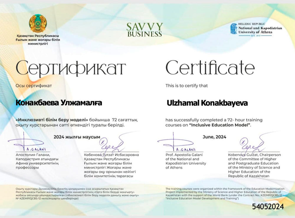 Оқыту курсында инклюзивті білім беруге байланысты өзекті мәселелер көтерілді. Курсты Каподистрия атындағы Афина университетінің PhD докторы, постдокторант-зерттеуші Валия Калайци және арнайы білім беру саласында PhD Йоргос Гкогкос өткізді. Инклюзивті білім беру жүйесіндегі өте құнды тақырыптар қарастырылды, атап айтқанда инклюзияның негізгі алғышарттары мен принциптері, кедергілерді жою, тең құқықты қамтамасыз ету, саралап оқыту, әмбебеп оқыту дизайны және т.б.. Курсқа ЖОО оқытушыларымен бірге мектеп мұғалімдері де қатысты. Өте маңызды тақырып болғаннан кейін қызу пікір-талас, дискуссия, пікір алмасу, түрлі жобаларды қорғау күнделікті орын алды. Біз үшін жаңа тақырыптарды да меңгердік. Курс аяқталған күні Қазақстан Республикасының Ғылым және жоғары білім министрлігінің қызметкерлері келіп, бізді құттықтап, инклюзия саласындағы өз ойларымен бөлісті. Жобаларымызды сәтті қорғап, сертификаттарымызды қолға алдық. Аса маңызды инклюзия саласында біліктілігімізді арттыру біз үшін өте маңызды еді, тілегіміз жүзеге асырылды. Университет басшылығына алғысымыз шексіз!