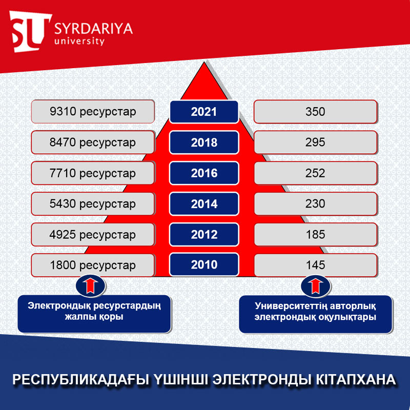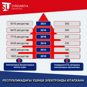 10 жыл ішінде «Сырдария» университетінің электронды кітапханасы Қазақстандағы ең танымал кітапханалардың бірі болып табылады. Университеттің барлық 9300 электронды ресурстары Қазақстан Республикасы ЖОО қауымдастығының қорына енгізілген. 2021 жылдың қорытындысы бойынша біздің университет электронды кітаптарды жүктеп алу саны бойынша үшінші орында
