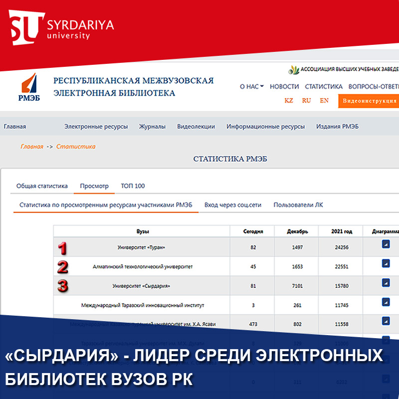 «Сырдария» университетінің электронды ресурстары биыл 15 мыңнан астам рет жүктелді! Алдымызда «Тұран» университеті мен Алматы технологиялық университеті ғана тұр. Бұған РМЭБ статистикасы дәлел. РМЭБ веб-сайтында (http://rmebrk.kz/statistics) университеттердің барлық электрондық ресурстарын пайдалану туралы толығырақ статистика көрсетіледі. Біздің барлық 9300 ресурстарымызды университетіміздің ғана емес, сонымен қатар басқа университеттердің студенттері мен оқытушылары белсенді түрде пайдаланады. Біздің оқу ресурстарымыздың қолжетімділігі веб-серверлеріміздің үздіксіз жұмысымен қамтамасыз етіледі. Ай сайын университеттің электронды кітапханасының қоры оқу үдерісінде сұранысқа ие жаңа электронды басылымдармен толықтырылып отырады. Кітаптарды сканерлеу арқылы қор қалыптасады, оқытушылармен бірлесіп жаңа мультимедиялық электронды оқулықтар әзірленуде. 2005 жылдан бері университет ұжымы авторлық куәліктері бар 350 электронды оқулық әзірледі.