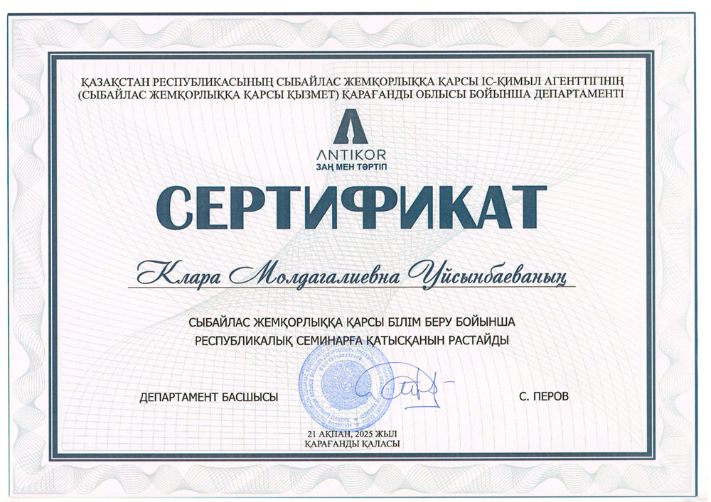21.02.2025 ж. Қарағанды қаласында Қазақстан Республикасының Сыбайлас жемқорлыққа қарсы іс қимыл агенттігі департаментің ұйымдастыруымен жоғары оқу орындарының оқытушылары үшін сыбайлас жемқорлыққа қарсы білім беру бойынша республикалық семинар өтті.