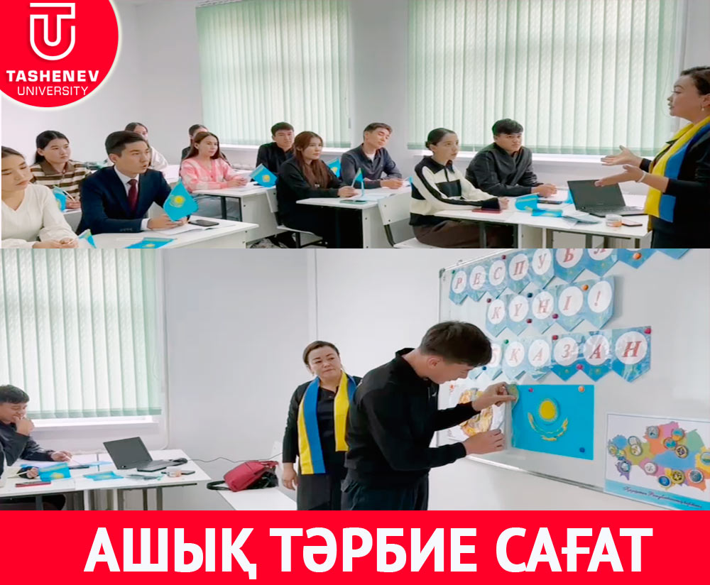 «Тарих және география» кафедрасының аға оқытушысы Жүзжасарова Акмарал Аймаханбетқызы 6В01414 "География, 6В01509 "География-тарих мұғалімдерін даярлау», 6В01601- «Тарих мұғалімдерін даярлау», білім беру бағдарламаларының 1 курс студенттерімен 25 қазан Республика күнінен орай ашық тәрбие сағатын өткізді. Іс-шара барысында тәлімгер студенттермен 1990 жылғы 25 қазандағы күннің тарихи маңыздылығы туралы, осы күні республикамыздың егемендігі туралы құжат қабылданғаны туралы әңгіме жүргізді. Сондай-ақ, викториналық сұрақтар қойылып оларға жауап беріп, тақырыпты жан-жақты талқылады. Ашық тәрбие сағатын студенттер патриоттық ән айтып, қорытындылады.