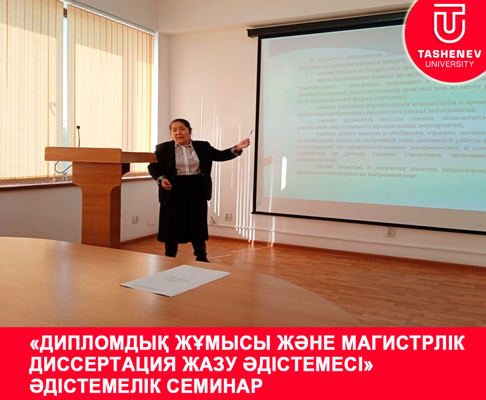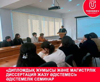 31.10.2024 жылы университеттің бас ғимаратының 207 аудиториясында. Ж. А. Ташеневтің жетекшілігімен "Экономика және басқару" кафедрасының меңгерушісі э. ғ. к., аға оқытушы Е. А. Бакировтың және э. ғ. к., аға оқытушысы А. А. Демесинованың жетекшілігімен "дипломдық жұмыс және магистрлік диссертация жазу әдістемесі" тақырыбында әдістемелік семинар өткізілді. Қатысушыларды экономикалық мамандықтар бойынша білім алушыларға арналған дипломдық жұмыстар мен магистрлік жұмыстарды жазудың қолданыстағы әдістемесімен таныстырды (қосымшаларды қараңыз). Бітіру жұмыстарының құрылымы мен мазмұнындағы айрықша ерекшеліктері мен ұқсас ерекшеліктерін атап өтті.