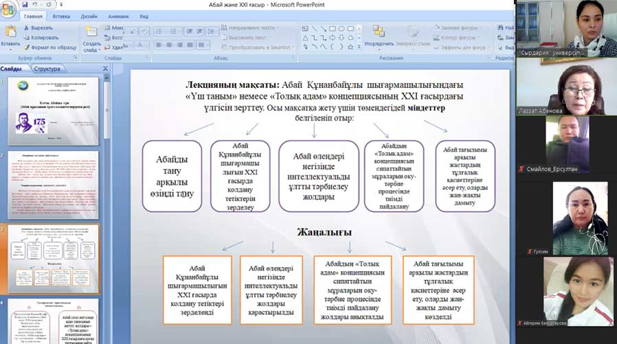 "Сырдария" университеті «Филология және гуманитарлық білім» факультеті «Қазақ тілі мен әдебиеті» кафедрасының қауымдастырылған профессор міндетін атқарушы, филология ғылымдарының кандидаты, абайтанушы Абенова Ләззат Усманқызы Абай Құнанбайұлының 175 жылдық мерейтойы аясында «Ұлтты Абайша сүю (Абай мұрасының тұлға қалыптастырудағы рөлі)» деген тақырыпта Online форматта ашық дәріс өткізді.