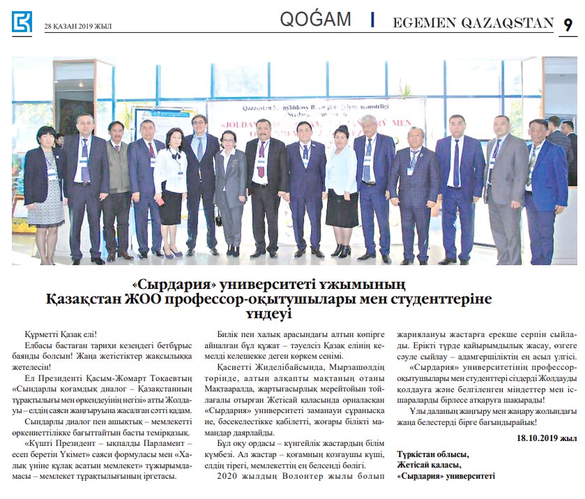 "Сырдария" университетінің профессороқытушылары мен студенттері сіздерді Жолдауды қолдауға жəне белгіленген міндеттер мен ісшараларды бірлесе атқаруға шақырады!