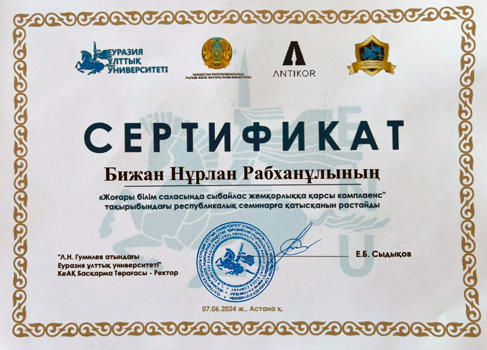 11.10.2021- 22.10.2021ж аралығында 72 сағат көлемінде «заң пәндері бойынша оқытудың заманауи технологиялары» тақырыбында біліктілікті арттыру курсын сәтті тамамдады