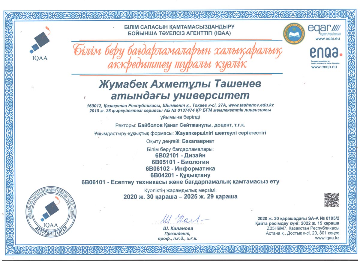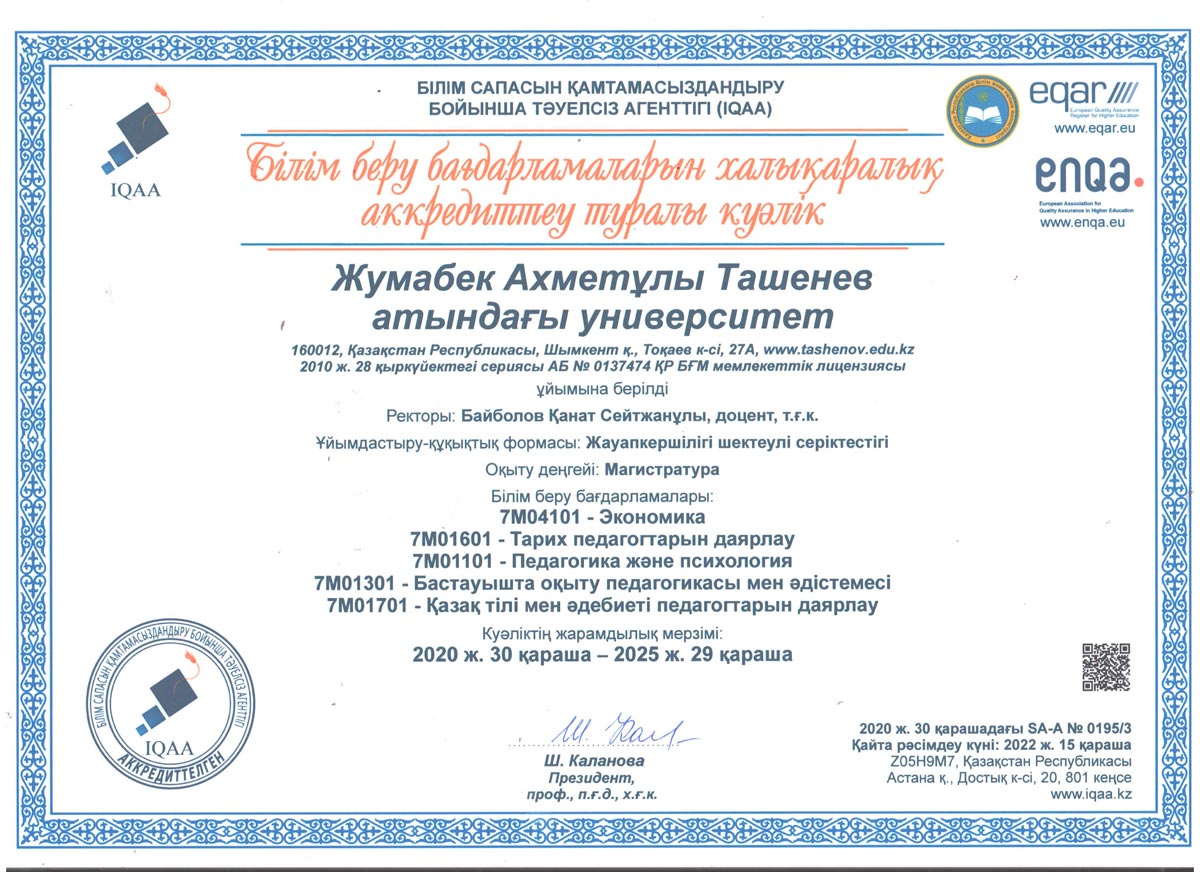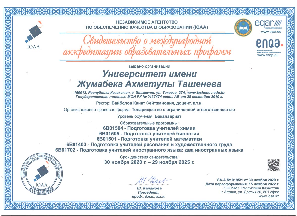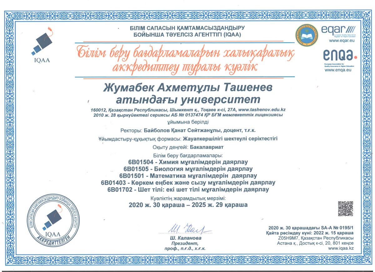1. 6В01101-"Педагогика және психология" 2. 6В01301-"Бастауышта оқыту педагогикасы мен әдістемесі" 3. 6В01402-Музыка мұғалімдерін даярлау 4. 6В01403-Көркем еңбек және сызу мұғалімдерін даярлау 5. 6В01501-Математика мұғалімдерін даярлау 6. 6В01504-Химия мұғалімдерін даярлау 7. 6В01505-Биология мұғалімдерін даярлау 8. 6В01506-География мұғалімдерін даярлау 9. 6В01601-Тарих мұғалімдерін даярлау 10. 6В01701-Қазақ тілі мен әдебиеті мұғалімдерін даярлау 11. 6В01702-Шет тілі: екі шет тілі мұғалімдерін даярлау 12. 6В02101-"Дизайн" 13. 6В04101-"Есеп және аудит" 14. 6В04102-"Қаржы" 15. 6В04103-"Экономика" 16. 6В04201-"Құқықтану" 17. 6В05101-"Биология" 18. 6В06101-"Есептеу техникасы және бағдарламалық қамтамасыз ету" 19. 6В06102 -"Информатика" |