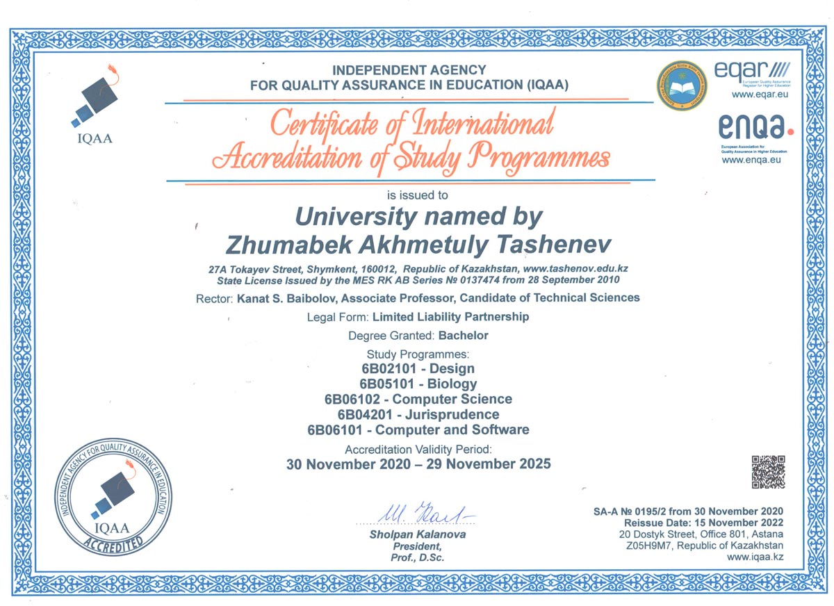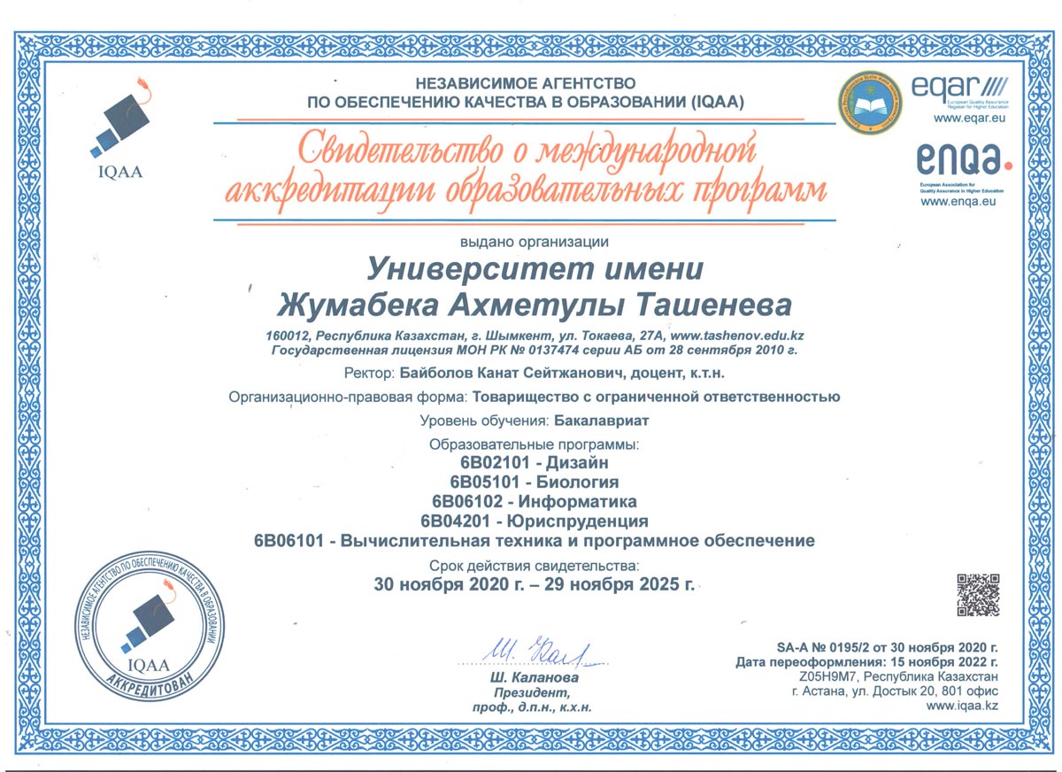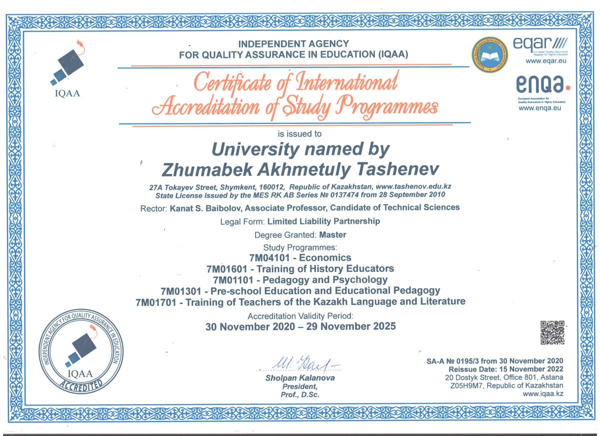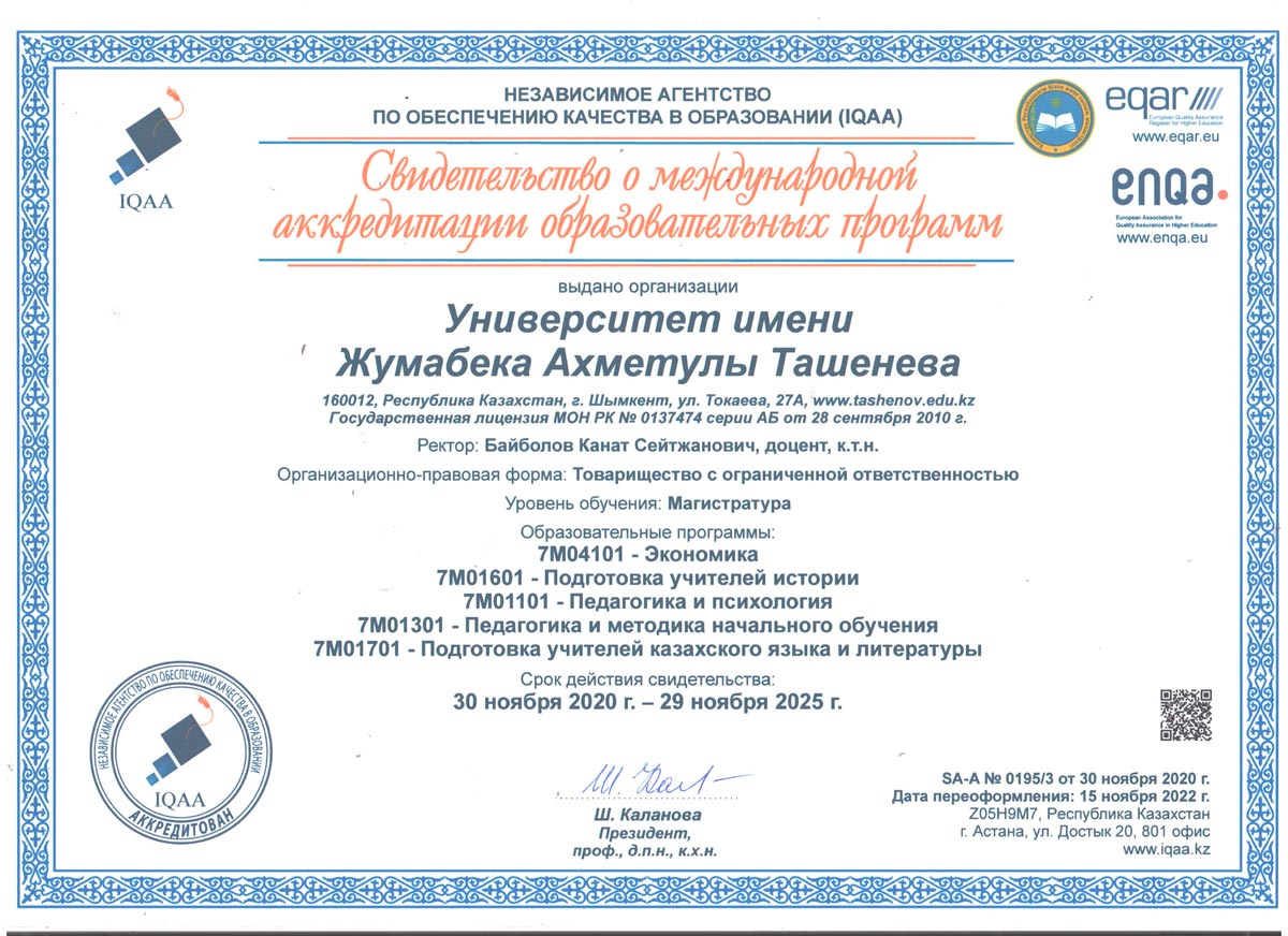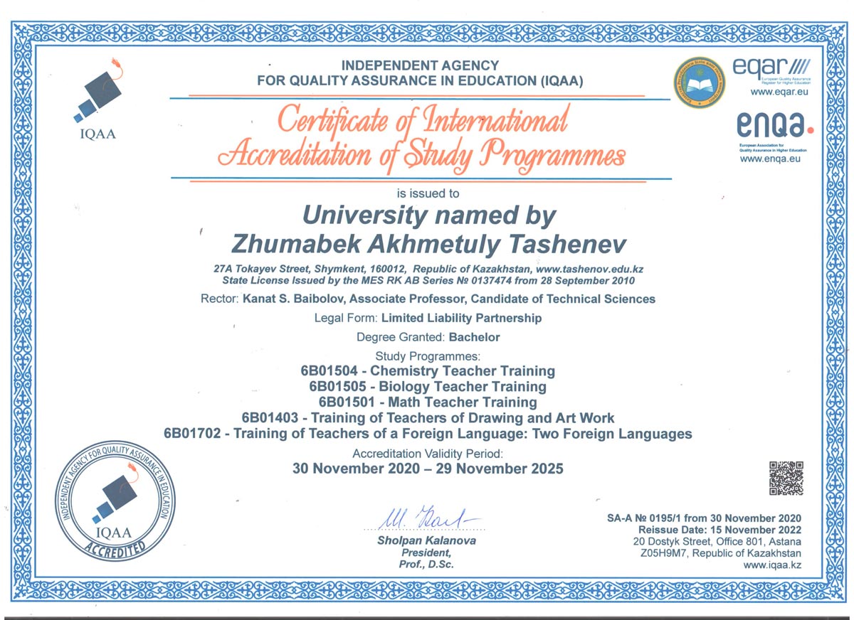 1. 6В01101-"Педагогика және психология" 2. 6В01301-"Бастауышта оқыту педагогикасы мен әдістемесі" 3. 6В01402-Музыка мұғалімдерін даярлау 4. 6В01403-Көркем еңбек және сызу мұғалімдерін даярлау 5. 6В01501-Математика мұғалімдерін даярлау 6. 6В01504-Химия мұғалімдерін даярлау 7. 6В01505-Биология мұғалімдерін даярлау 8. 6В01506-География мұғалімдерін даярлау 9. 6В01601-Тарих мұғалімдерін даярлау 10. 6В01701-Қазақ тілі мен әдебиеті мұғалімдерін даярлау 11. 6В01702-Шет тілі: екі шет тілі мұғалімдерін даярлау 12. 6В02101-"Дизайн" 13. 6В04101-"Есеп және аудит" 14. 6В04102-"Қаржы" 15. 6В04103-"Экономика" 16. 6В04201-"Құқықтану" 17. 6В05101-"Биология" 18. 6В06101-"Есептеу техникасы және бағдарламалық қамтамасыз ету" 19. 6В06102 -"Информатика" |