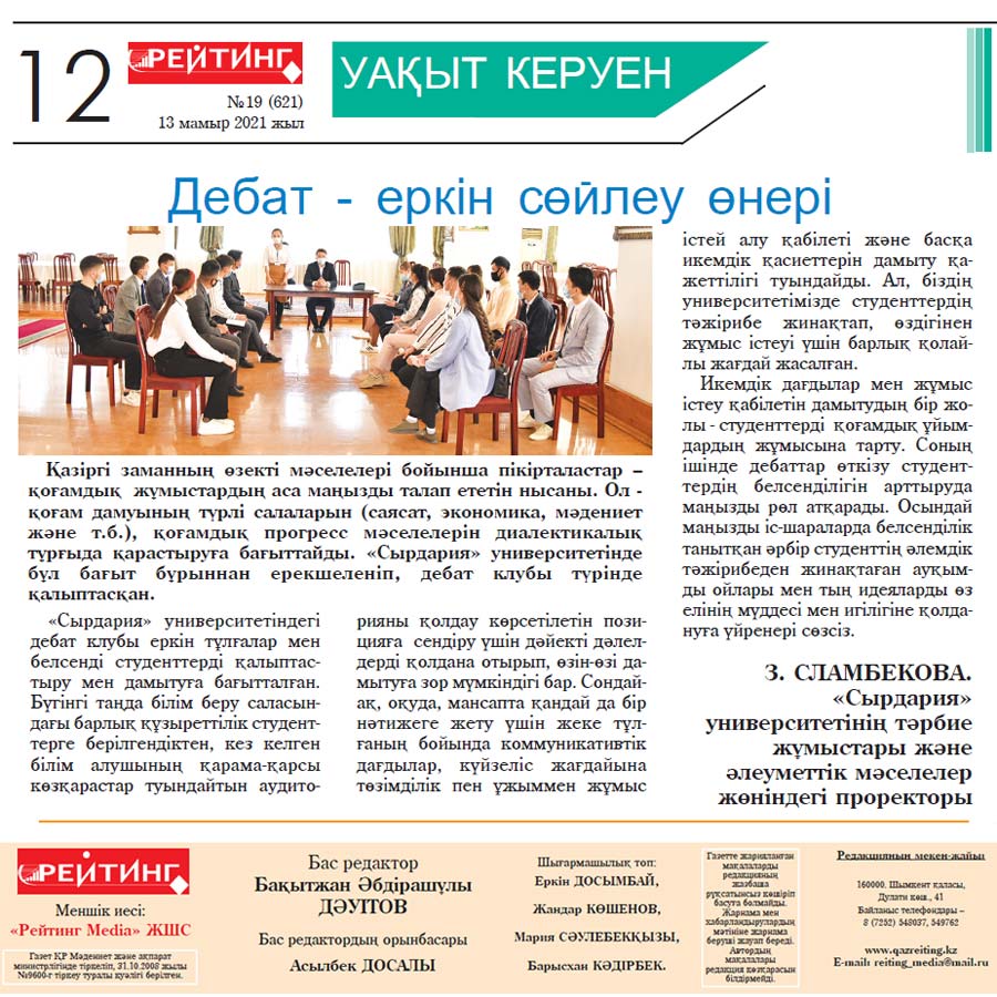 «Сырдария» университетіндегі дебат клубы еркін тұлғалар мен белсенді студенттерді қалыптастыру мен дамытуға бағытталған. Бүгінгі таңда білім беру саласындағы барлық құзыреттілік студенттерге берілгендіктен, кез келген білім алушының қарама-қарсы көзқарастар туындайтын аудиторияны қолдау көрсетілетін позицияға сендіру үшін дәйекті дәлелдерді қолдана отырып, өзін-өзі дамытуға да зор мүмкіндігі бар. Сондай-ақ, оқуда да, мансапта да қандай да бір нәтижеге жету үшін жеке тұлғаның бойында коммуникативтік дағдылар, күйзеліс жағдайына төзімділік пен ұжыммен жұмыс жасай алу қабілеті және басқа да икемдік қасиеттерін дамыту қажеттілігі туындайды. Ал, біздің университетімізде студенттердің тәжірибе жинақтап, өздігінен жұмыс істеуі үшін барлық қолайлы жағдайлар жасалған.