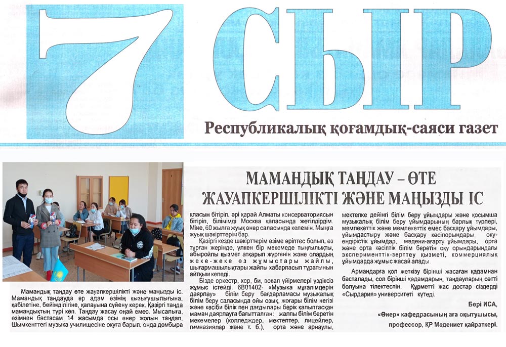Мамандық таңдау өте жауапкершілікті және маңызды іс. Мамандық таңдауда әр адам өзінің қызығушылығына, қабілетіне, бейімділігіне, қалауына сүйену керек. Қазіргі таңда мамандықтың түрі көп. Таңдау жасау оңай емес. Мысалыға, өзімнен бастасам 14 жасымда осы өнер жолын таңдап, Шымкенттегі музыка училищесіне оқуға барып, онда домбыра класын бітіріп, әрі қарай Алматы консерваториясын бітіріп, білімімді Москва қаласында жетілдірдім. Міне, 60 жылға жуық өнер саласында келемін. Мыңға жуық шәкірттерім бар.