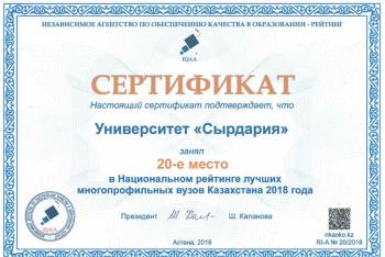 Білім берудің сапасын қамтамасыздандыру бойынша тәуелсіз агенттігінің Қазақстанның үздік көпсалалы ЖОО 2018 жылғы ұлттық рейтінгісінде "Сырдария" университеті 20-орынға ие болды.