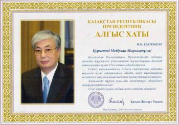 Қасым-Жомарт Тоқаев өзінің алғыс хатында:
