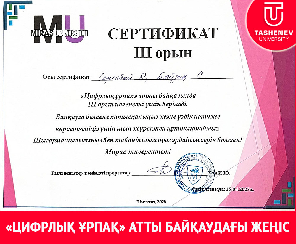 Мирас университеті ұйымдастырған «Цифрлық ұрпақ» атты байқауға қатысып, үздіктер қатарынан көрінген "IT және шетел тілдері" факультеті "Ақпараттық коммуникациялық технологиялар" кафедрасының ИЭФ-24-9к1 тобының студенті Серікбай Даниярды III орын иеленуімен шын жүректен құттықтаймыз!