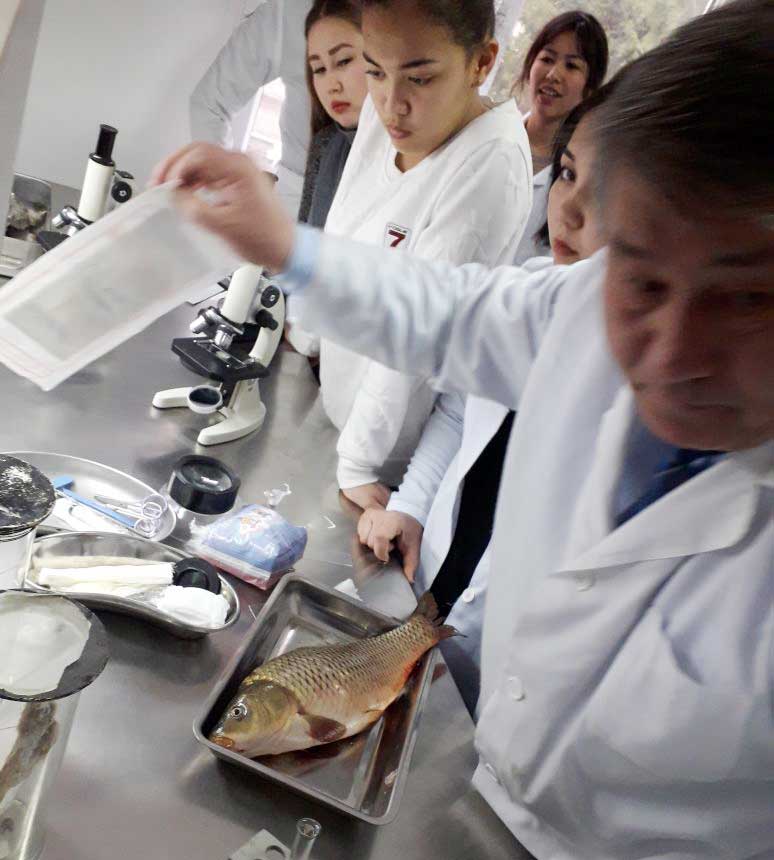 Ғылыми үйірме жетекшісі ғ.м., оқытушы С.Ж. Абдуова және доцент Р.А. Кашкаров жұмыс барысында студенттерге тәжірибе барысында шортан, қара балық және торта балықтарынның морфологиялық, физиологиялық және биологиялық талдаулары жүргізілді.
