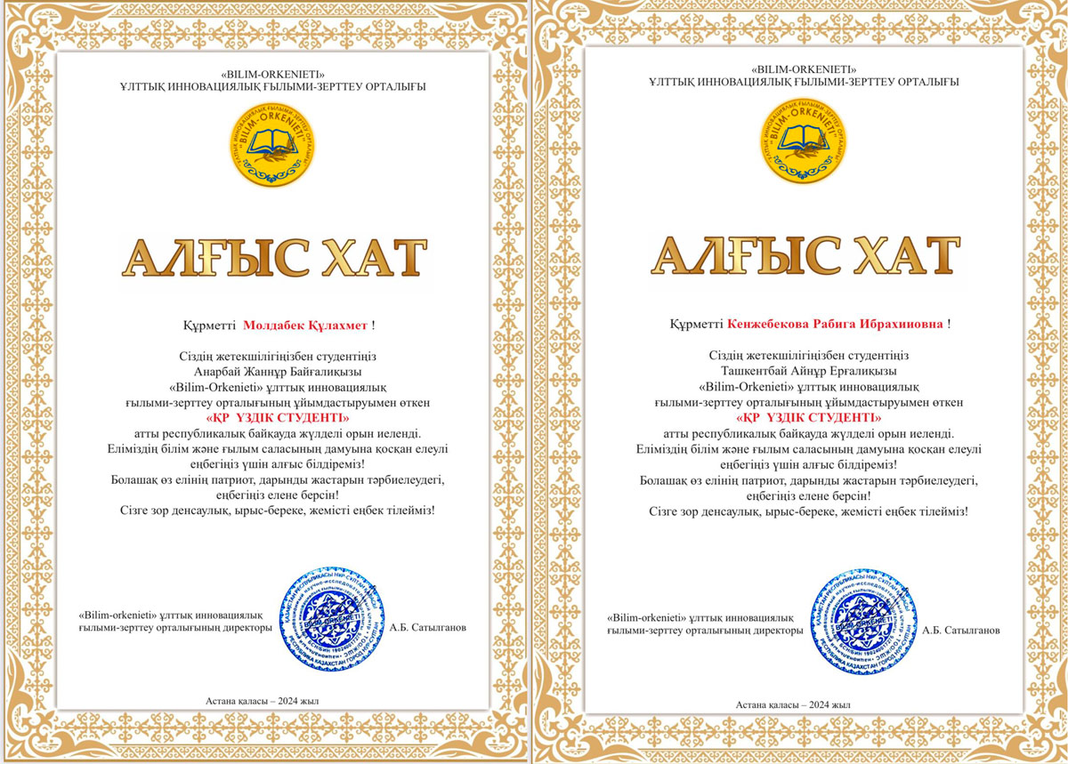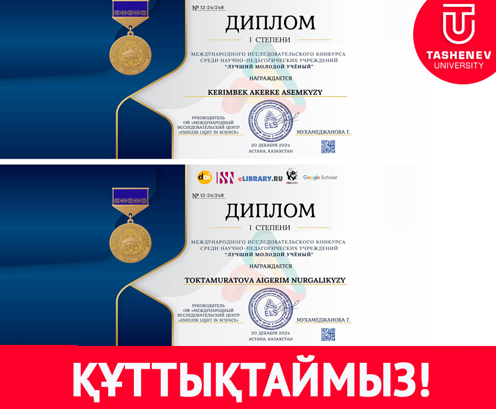 Ж.А.Тәшенев атындағы университеті Педагогика және Жаратылыстану ғылымдар   факультеті, «Педагогика және бастауышта оқыту әдістемесі» кафедрасының профессорлары Қ.Молдабек пен Р.И.Кенжебекова және кафедра меңгерушісі Г.А.Жапбаровалардың  жетекшіліктерімен  МПиК 23-5к  2 Курс және МПиК 24-5к  1 Курс магистранттары  2024 жылдың 20 желтоқсанда Астана қаласында "Үздік жас ғалым" ғылыми-педагогикалық мекемелері арасындағы халықаралық зерттеу байқауында қатысып, төсбелгісімен және I дәрежелі дипломмен марапатталды.