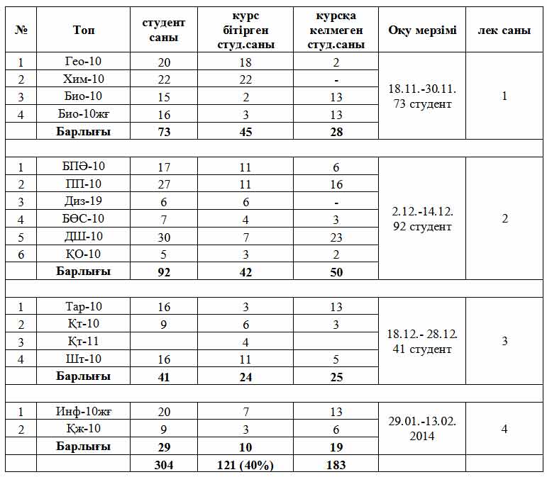 Курсты тыңдаушылар контингенті 304 студент болуына байланысты сабақтарды төрт лекке бөліп оқыту жоспарланды (3 лек– 1-ші жарты жылда, 1 лек–2-ші жарты жылда), ал 121 студент (40%) осы курсы толық бітірді (төменгі кестеде көрсетілген).