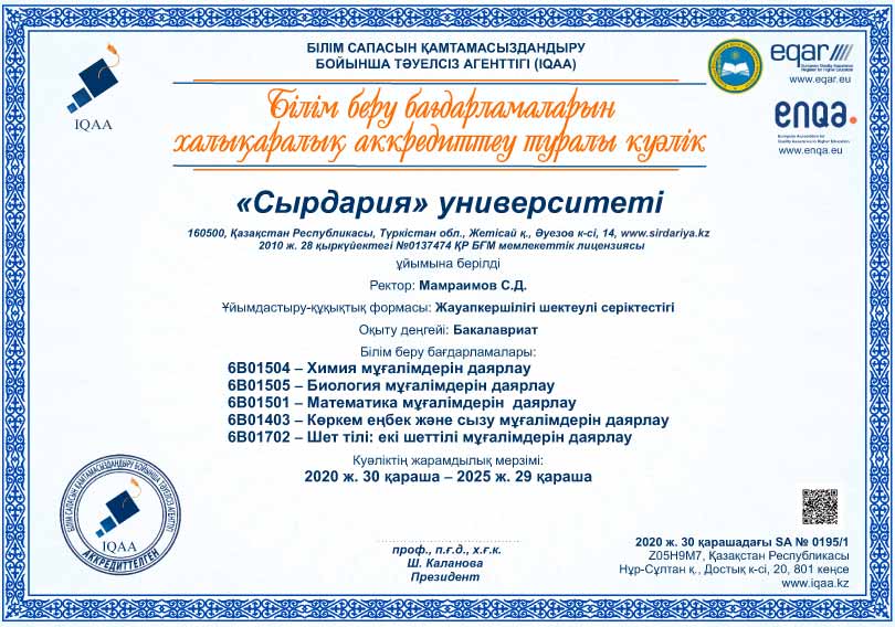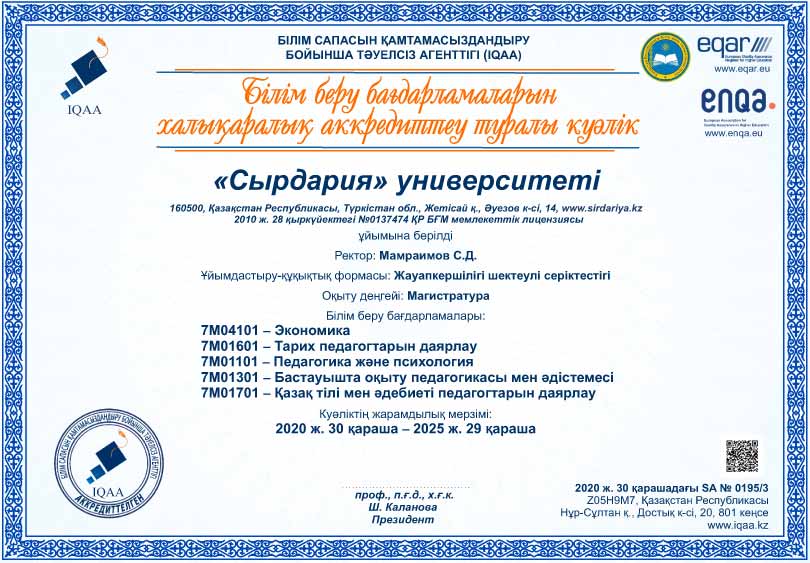 Аудит қорытындысы бойынша «Сырдария» университетінің 19 Білім беру бағдарламаларын халықаралық аккредиттеу туралы куәлік берілді.