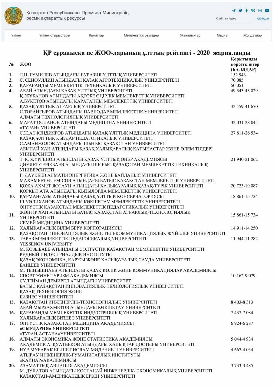 "СЫРДАРИЯ" УНИВЕРСИТЕТІ – ҚАЗАҚСТАН ЖОО АРАСЫНДА ТОП-20 ҚАТАРЫНДА