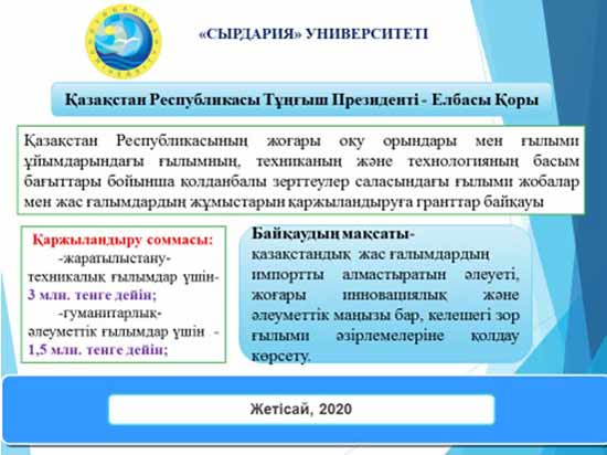 «Сырдария» университеті Қазақстан Республикасының жоғары оқу орындары мен ғылыми ұйымдарының жас қазақстандық ғалымдардының ғылымның басым бағыттары бойынша қолданбалы ғылыми-зерттеу саласындағы ғылыми-зерттеу жобалары мен жұмыстарын қаржыландыруға арналған конкурсқа қатысу үшін университеттің жас ғалымдарының 3 жобасын дайындап тапсырды.