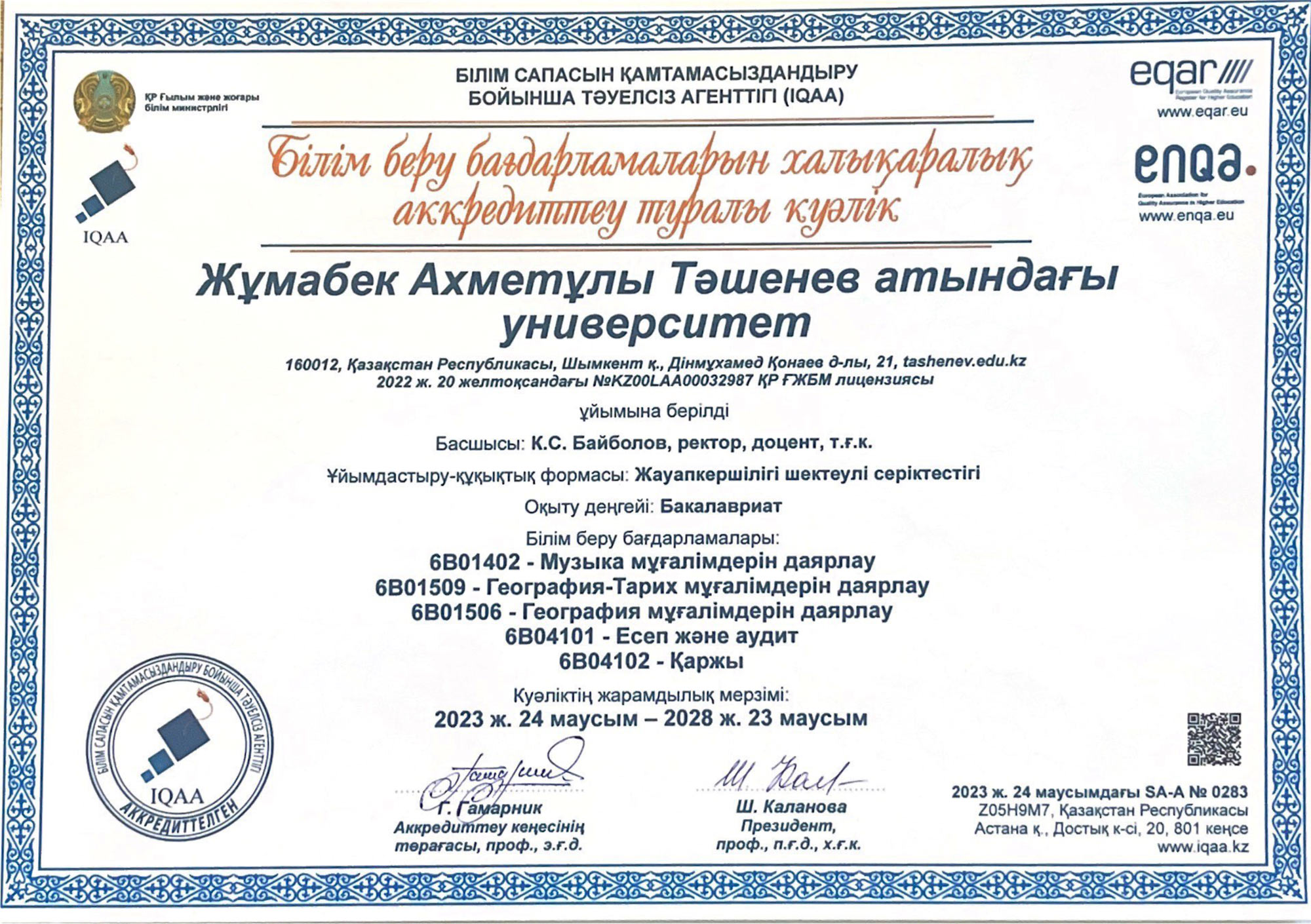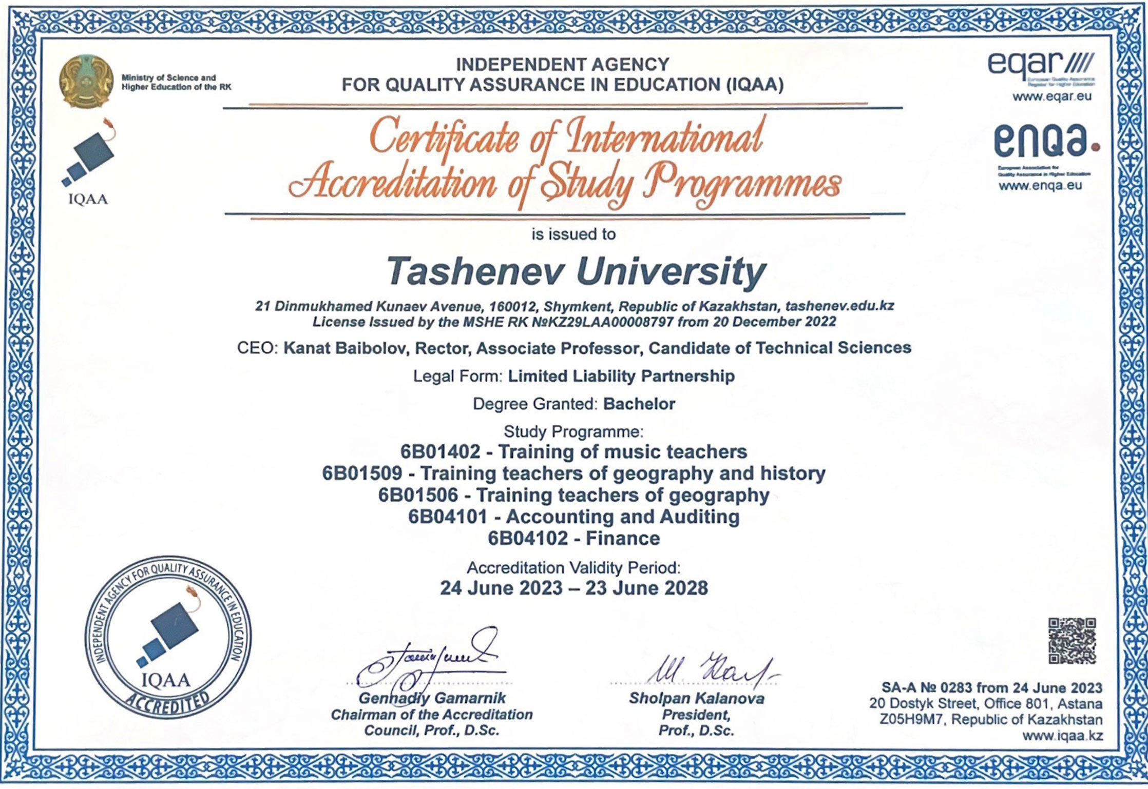 ► 22.06.2023. Свидетельство о специализированной международной аккредитации (6В04103 - Экономика). Срок действия: 22.06.2028