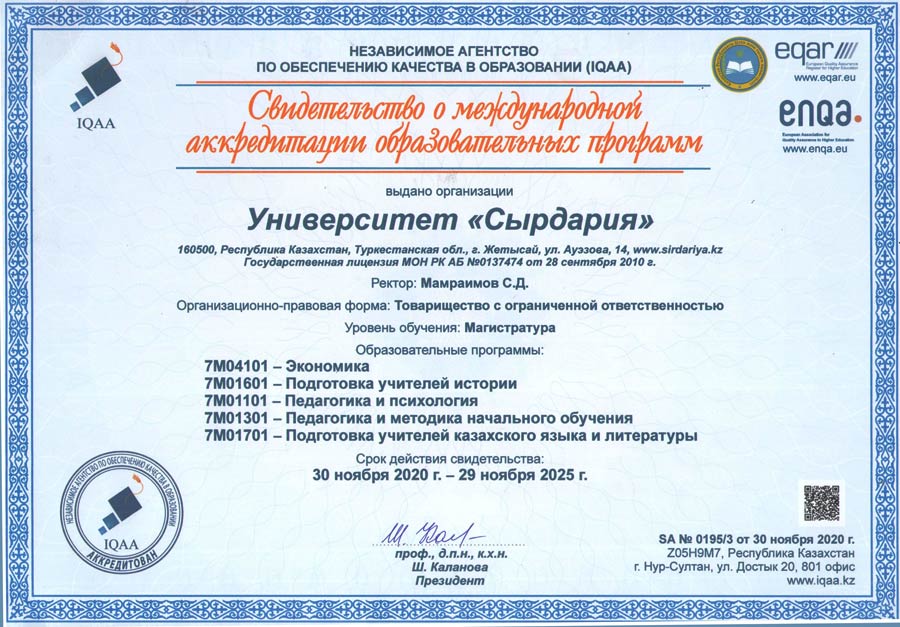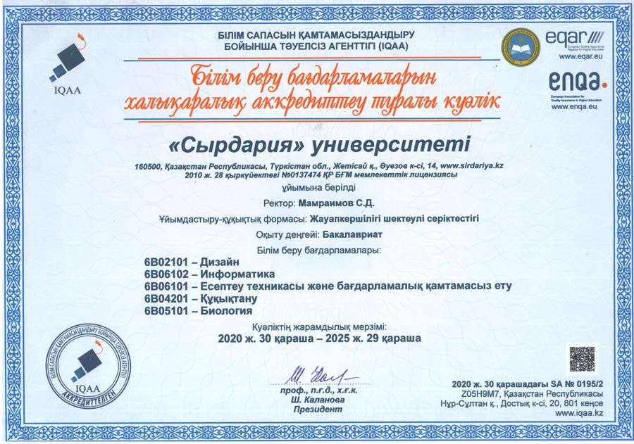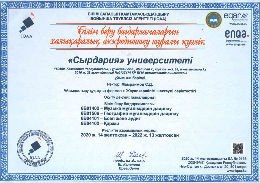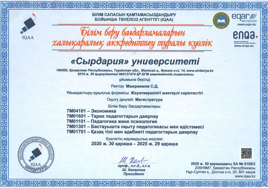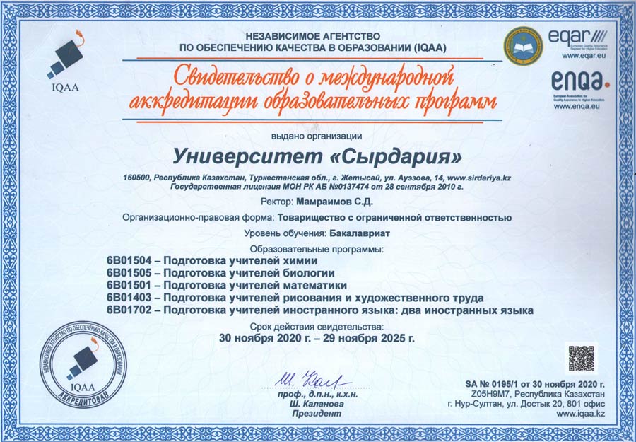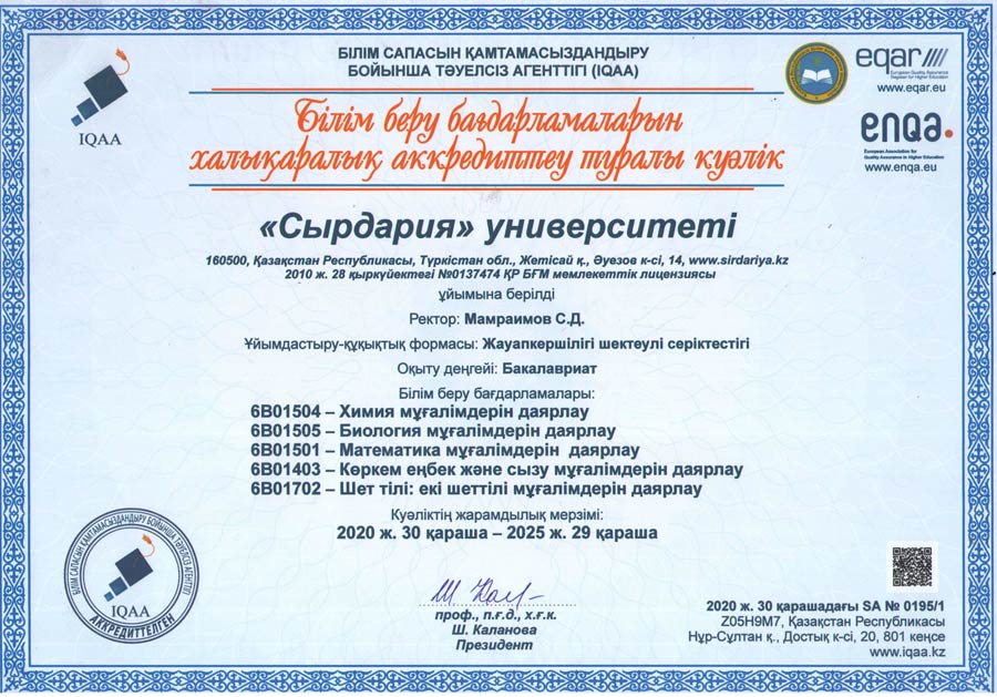 1. 6В01101-"Педагогика және психология" 2. 6В01301-"Бастауышта оқыту педагогикасы мен әдістемесі" 3. 6В01402-Музыка мұғалімдерін даярлау 4. 6В01403-Көркем еңбек және сызу мұғалімдерін даярлау 5. 6В01501-Математика мұғалімдерін даярлау 6. 6В01504-Химия мұғалімдерін даярлау 7. 6В01505-Биология мұғалімдерін даярлау 8. 6В01506-География мұғалімдерін даярлау 9. 6В01601-Тарих мұғалімдерін даярлау 10. 6В01701-Қазақ тілі мен әдебиеті мұғалімдерін даярлау 11. 6В01702-Шет тілі: екі шет тілі мұғалімдерін даярлау 12. 6В02101-"Дизайн" 13. 6В04101-"Есеп және аудит" 14. 6В04102-"Қаржы" 15. 6В04103-"Экономика" 16. 6В04201-"Құқықтану" 17. 6В05101-"Биология" 18. 6В06101-"Есептеу техникасы және бағдарламалық қамтамасыз ету" 19. 6В06102 -"Информатика" |