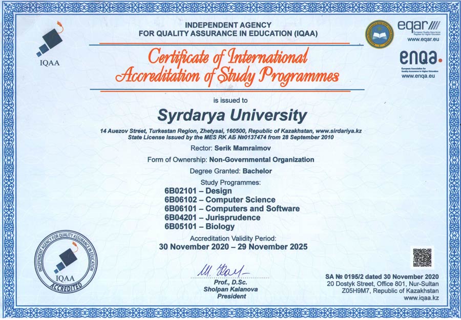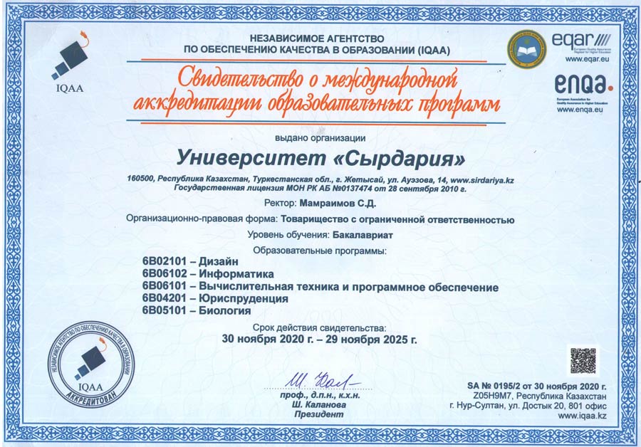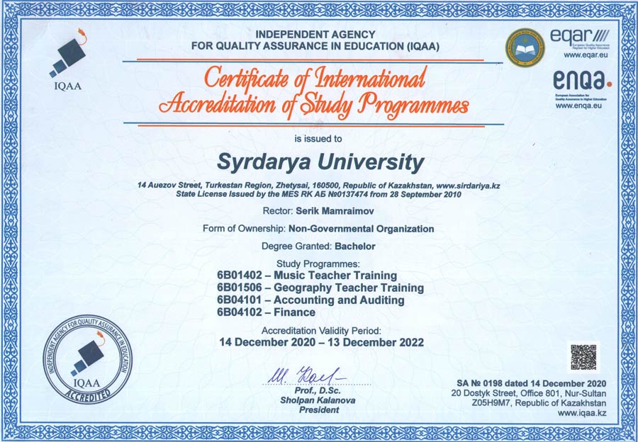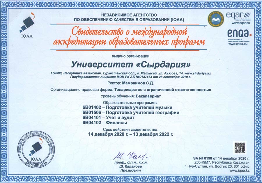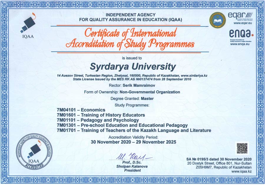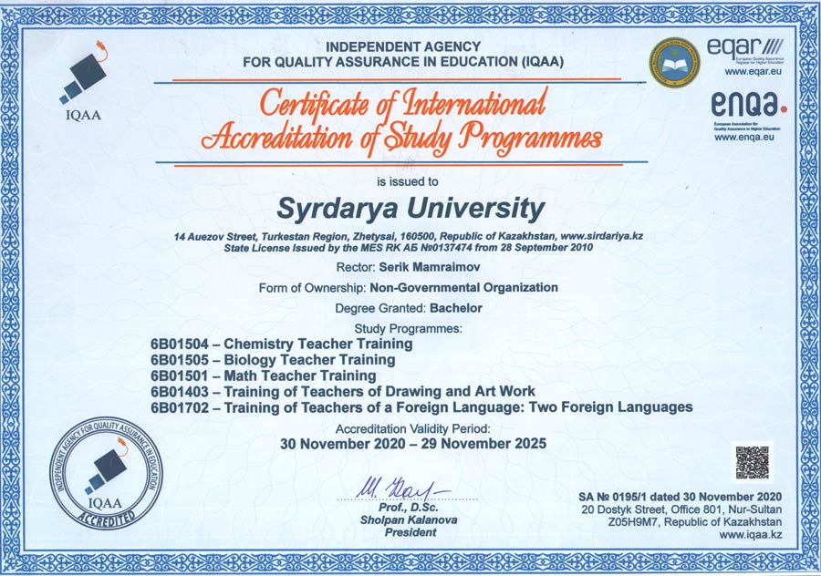 1. 6В01101-"Педагогика және психология" 2. 6В01301-"Бастауышта оқыту педагогикасы мен әдістемесі" 3. 6В01402-Музыка мұғалімдерін даярлау 4. 6В01403-Көркем еңбек және сызу мұғалімдерін даярлау 5. 6В01501-Математика мұғалімдерін даярлау 6. 6В01504-Химия мұғалімдерін даярлау 7. 6В01505-Биология мұғалімдерін даярлау 8. 6В01506-География мұғалімдерін даярлау 9. 6В01601-Тарих мұғалімдерін даярлау 10. 6В01701-Қазақ тілі мен әдебиеті мұғалімдерін даярлау 11. 6В01702-Шет тілі: екі шет тілі мұғалімдерін даярлау 12. 6В02101-"Дизайн" 13. 6В04101-"Есеп және аудит" 14. 6В04102-"Қаржы" 15. 6В04103-"Экономика" 16. 6В04201-"Құқықтану" 17. 6В05101-"Биология" 18. 6В06101-"Есептеу техникасы және бағдарламалық қамтамасыз ету" 19. 6В06102 -"Информатика" |