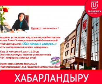Приглашаем Вас на творческий вечер «Празднование желаний души...», организованный по случаю юбилея заслуженного учителя, литературоведа Лаззат Усмановны. Вечер состоится 16 мая в 11:00 в конференц-зале 414 Университета Жумабека Ахметулы Ташенева.