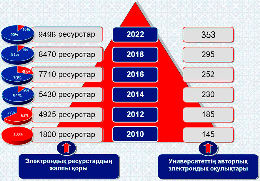 В университете функционирует богатая электронная библиотека вуза, общий фонд которой составляет 9502 ресурсов, из которых на казахском языке 4908, на русском 3964 и на английском 630. В центре цифровизации вуза планомерно разрабатываются новые электронные учебники (353 экземпляра), которые активно используются в учебном процессе. Авторы получают авторские свидетельства из комитета по интеллектуальной собственности. Все ресурсы классифицированы по образовательным программам и хранятся на веб-сервере вуза. Адрес электронной библиотеки вуза http://lib.tashenev.edu.kz. Для автоматизации книговыдачи используется система ИРБИС.