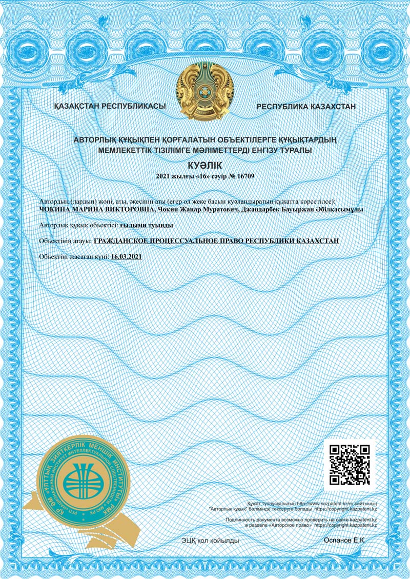 Заведующий кафедры «Право и экономика», доктор юридических наук Жандарбек Бауржан Абылкасымович совместно с известными юристами Чокиной М.В. и Чокиным Ж.М. 16.03.2021 г. подготовили учебник, как произведение науки «Гражданское процессуальное право Республики Казахстан» и получили Авторское свидетельство № 16709.