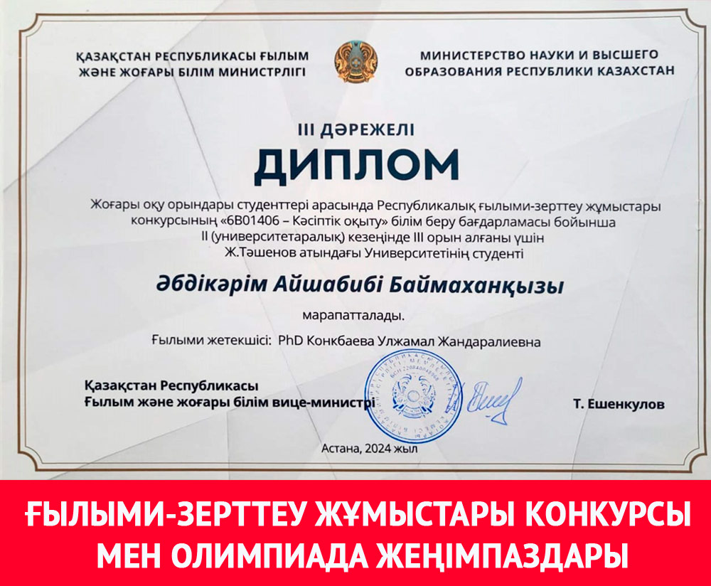 Именно поэтому студенты факультета «Начальное образование и искусство» очень активно занимаются научно-исследовательской работой и мы можем с большой гордостью сказать, что в 2023-2024 учебном году они достигли следующих достижений. В частности, студентка профессионального образования группы ПИК-21-16к2 Абдикарим Айшабиби Баймахановна прошла 2-й межвузовский этап Республиканской олимпиады научных работ среди студентов высших учебных заведений и была награждена дипломом 3-й степени. Вместе с тем, команда «Томирис», состоящая из 4 студентов, вновь была награждена дипломом III степени на XVI Республиканской дисциплинарной олимпиаде среди студентов высших учебных заведений Республики Казахстан в области профессиональной подготовки. В частности, Авес Хадиша Сапарковна, Абдикарим Айшабиби Баймахановна, Мамрайм Дарига Абдигаппаровна. Мы гордимся и всегда поддерживаем таких активных студентов нашего факультета.