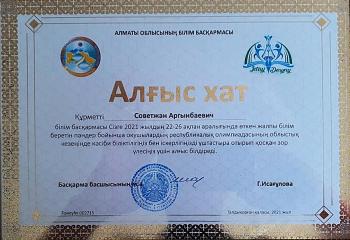 Управление образования Алматинской области благодарит Ынтымакова Советжана Аргынбаевича за весомый вклад в региональный этап Республиканской олимпиады по общеобразовательному образованию, который прошел с 22 по 26 февраля 2021 года, Вы сочетаете в себе профессиональные навыки и деловую хватку.