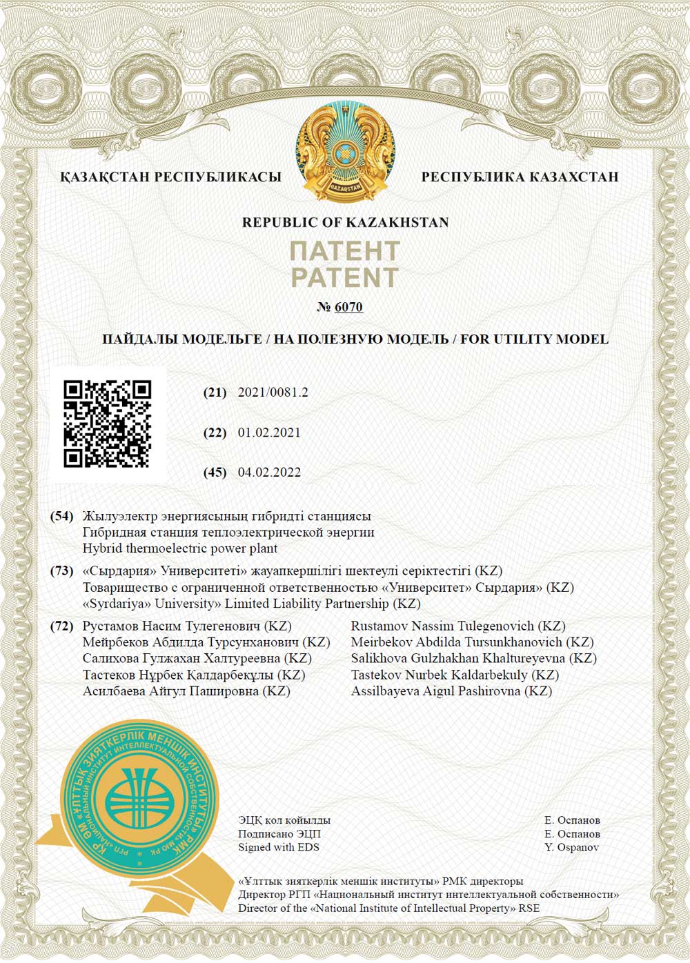 Полное описание полезной модели к патенту доступно на официальном сайте www.kazpatent.kz