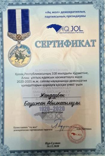 Заведующий кафедрой «Правоведение и экономика», доктор юридических наук Жандарбек Б.А. награжден золотой медалью и грамотой за активное участие в качестве наблюдателя в избирательной кампании депутатов Парламента Республики Казахстан и местных маслихатов, которая прошла в начале этого года (10 января).
