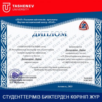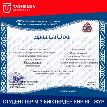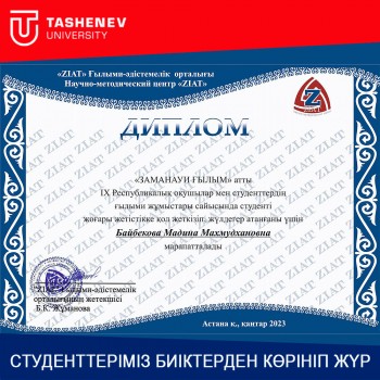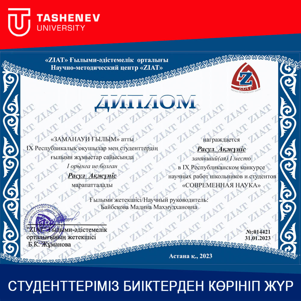 Улдана Раш, Даяна Доскалиева, Акжунис Расул и их руководители, признанные победителями центрального конкурса, вручили дипломы проректору Tashenev University по научно-исследовательской работе Шолпан Арзымбетовой и заведующей кафедрой Мадине Байбековой.